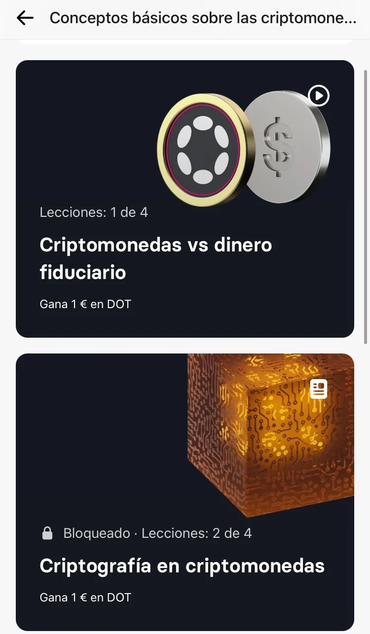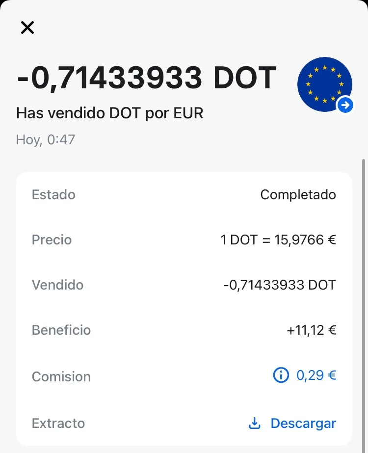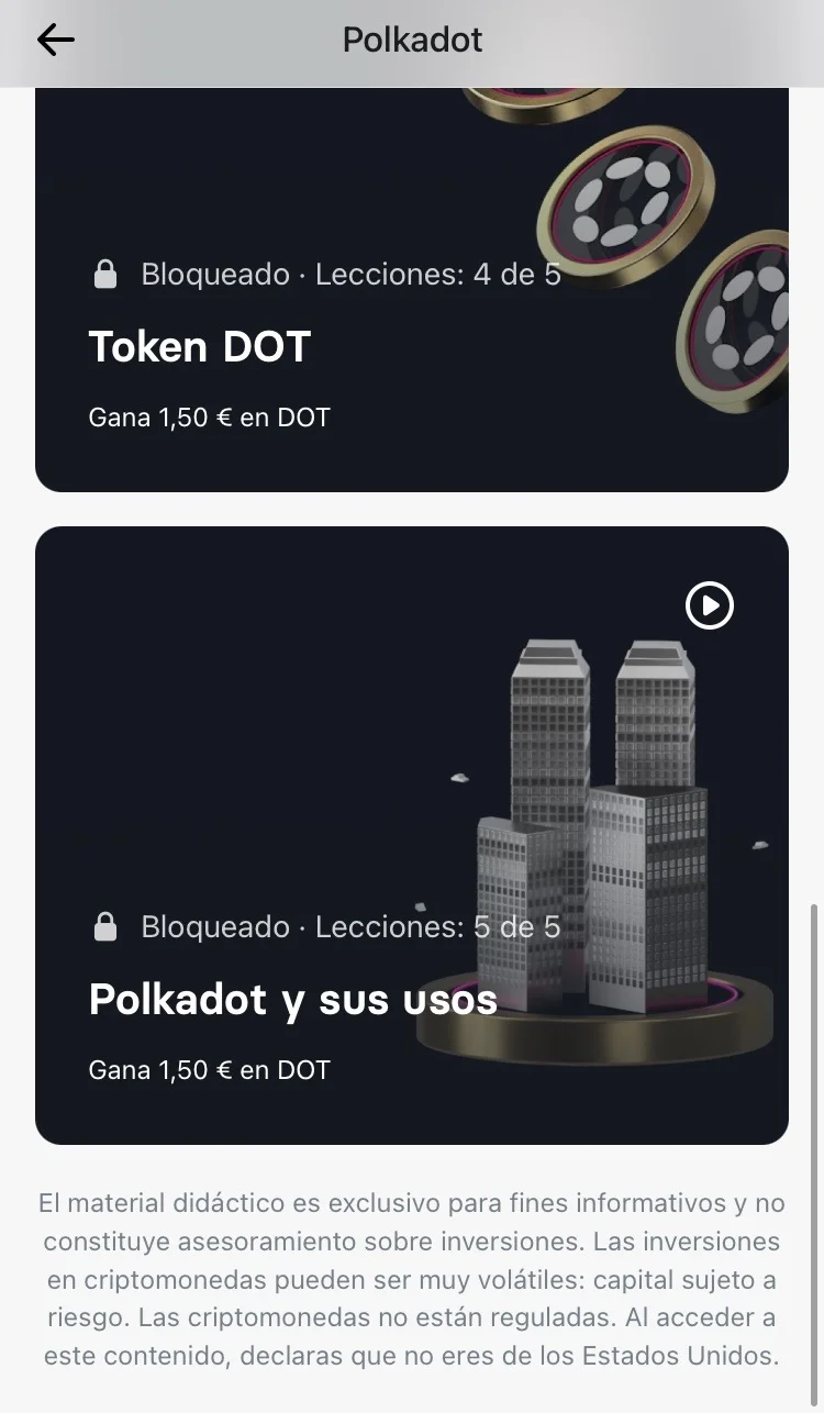 Despúes de completar las 2 lecciones recibirás 1€ en DOT y lo podrás vender por € al instante con una comisión de 1 céntimo. Recibirás el dinero directamente en tu cuenta bancaria de Revolut.