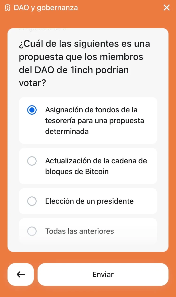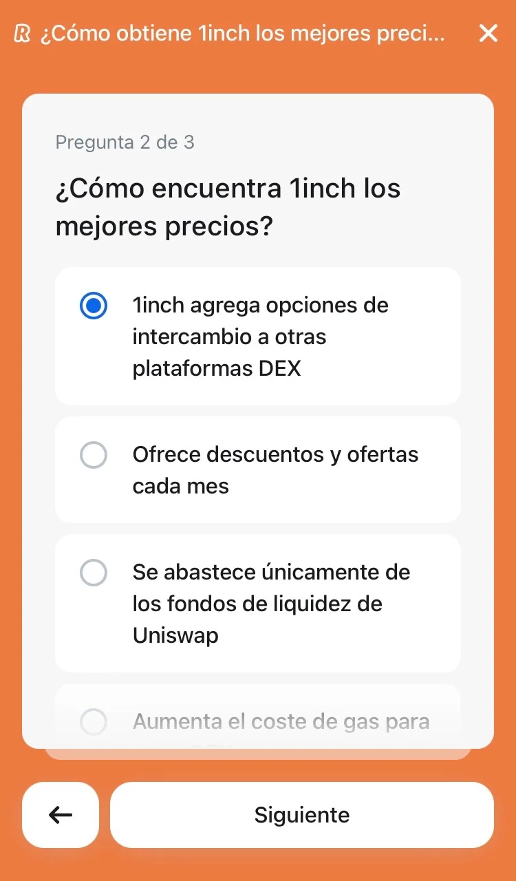 Nuevo test de Revolut Earn en el que obtendrás 1.50€ en la criptomoneda 1INCH completando 3 sencillos cuestionarios de 3 preguntas cada uno.