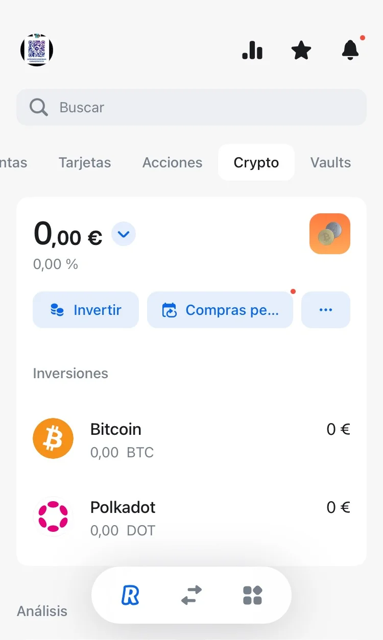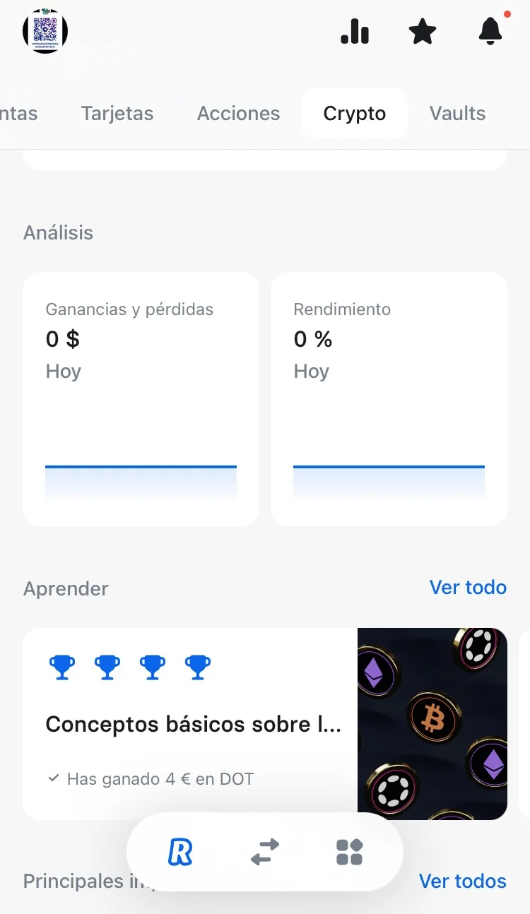 Una vez hayas actualizado la APP, inicia sesión en Revolut. Accede al menú de arriba y cambia entre la pestaña cuentas a la de Crypto.
