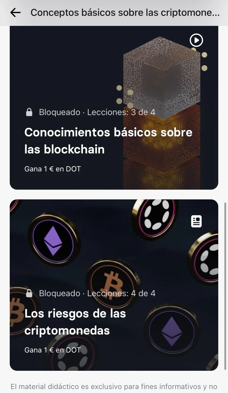 Ahora baja hasta abajo a donde pone aprender e inicia el primer curso de 4 lecciones de 3 preguntas cada una con el que ganarás 14€ en DOT.