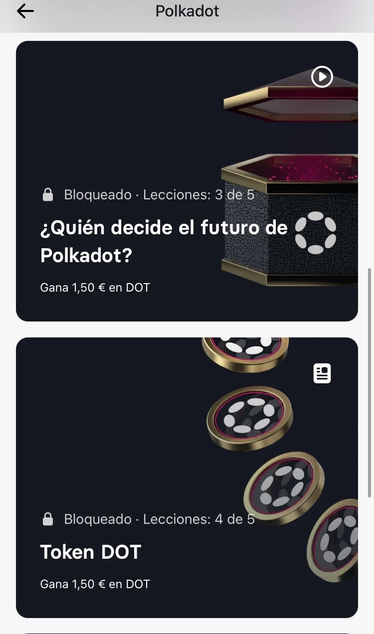 Otro curso diferente sobre Polkadot con el que ganarás 14€ en DOT por completar correctamente las 5 lecciones de 3 preguntas cada una. Como en el anterior curso tendrás que ver obligatoriamente los vídeos, hay 3 vídeos de menos de 1 minuto cada uno.