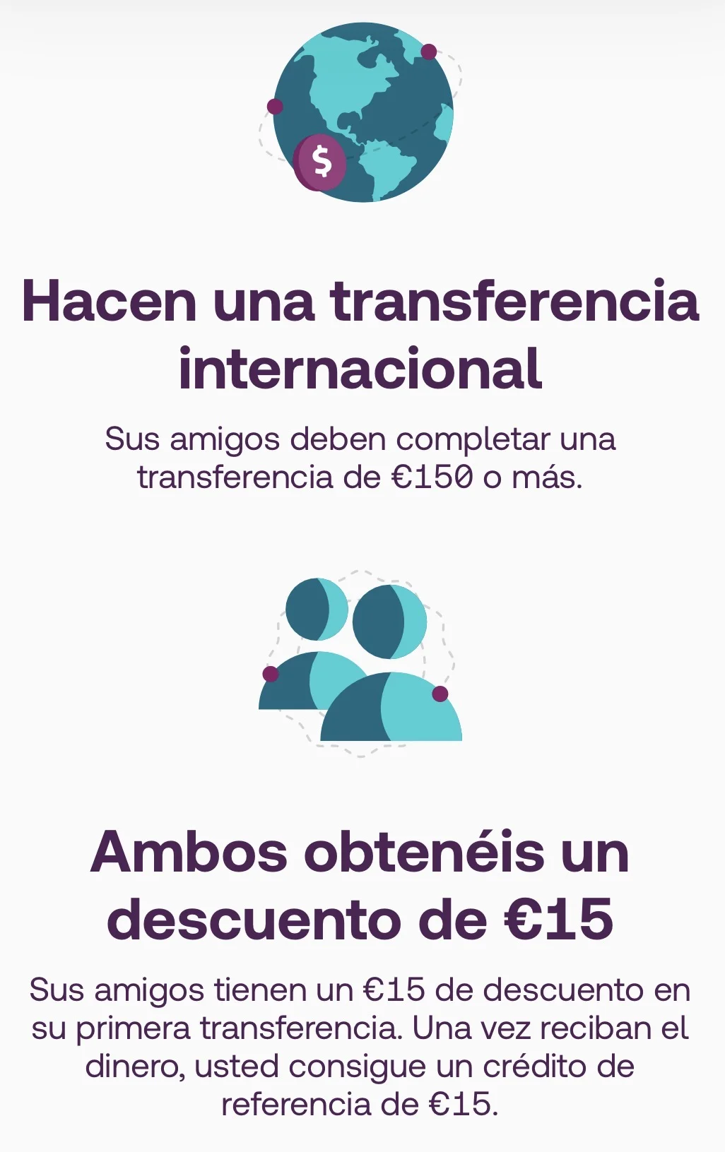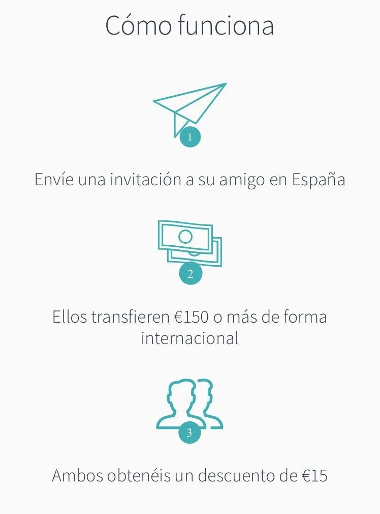 La persona que invites también recibirá un descuento directo de 15€ en la transferencia internacional que realice.